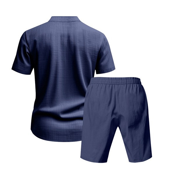 American Linen Suit Men’s Summer Short Sleeve Elevate your warm-weather wardrobe with the American Linen Suit Men’s Summer Short Sleeve set. Designed with a breathable linen fabric, this two-piece outfit includes a short-sleeve shirt and coordinating shorts, offering a relaxed yet refined look that’s perfect for casual summer occasions.