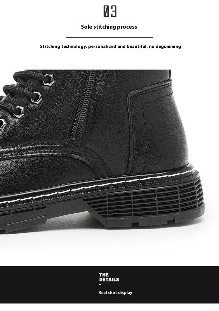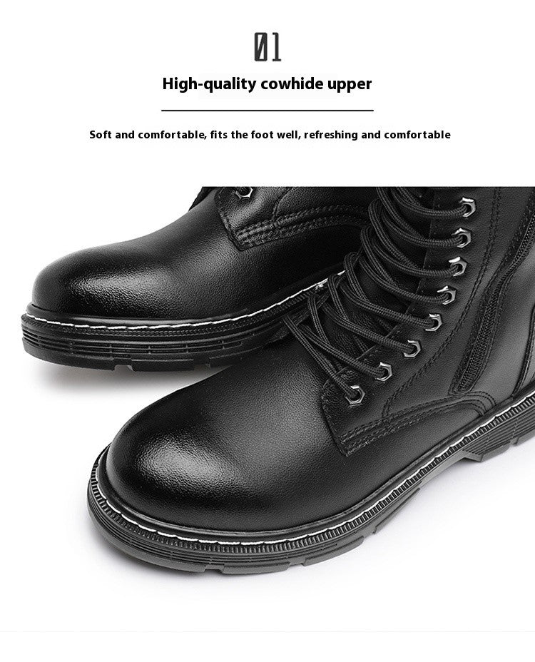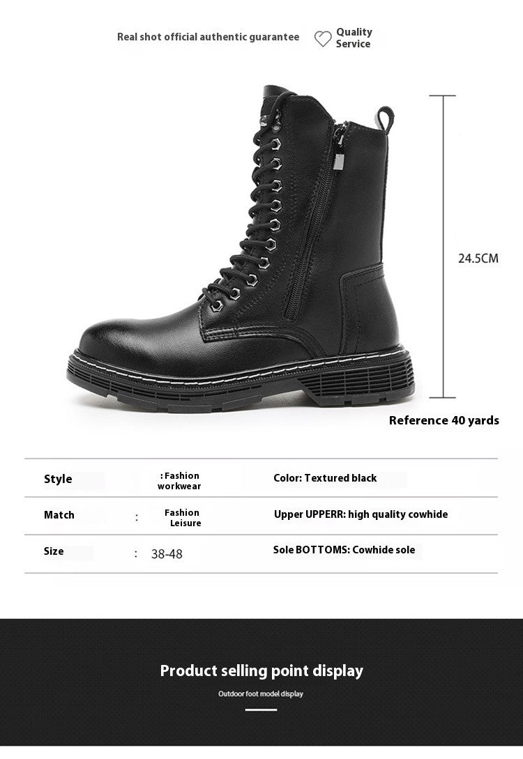 • Key Features High-top Martin boot design for ankle and lower leg support Genuine leather upper for durability and classic appeal Optional cotton lining for extra insulation in winter Round toe for comfort and natural movement Non-slip rubber sole for reliable grip Wide size range: 38–48 Ideal for autumn and winter wear Product Details Upper Material: Genuine leather Closure: Front lace-up Boot Height: High cylinder Heel Height: Low (1–3cm) Toe Shape: Round head Sole Material: Rubber Function: Non-slip, warm Sizes: 38, 39, 40, 41, 42, 43, 44, 45, 46, 47, 48 Colours: Black (standard), Black (cotton lining option) Style: High-top Martin boots / Casual Season: Autumn, Winter Target Age: Youth (18–40 years) Ideal For: Cold-weather casual wear, outdoor activities, or everyday urban winter outfits.