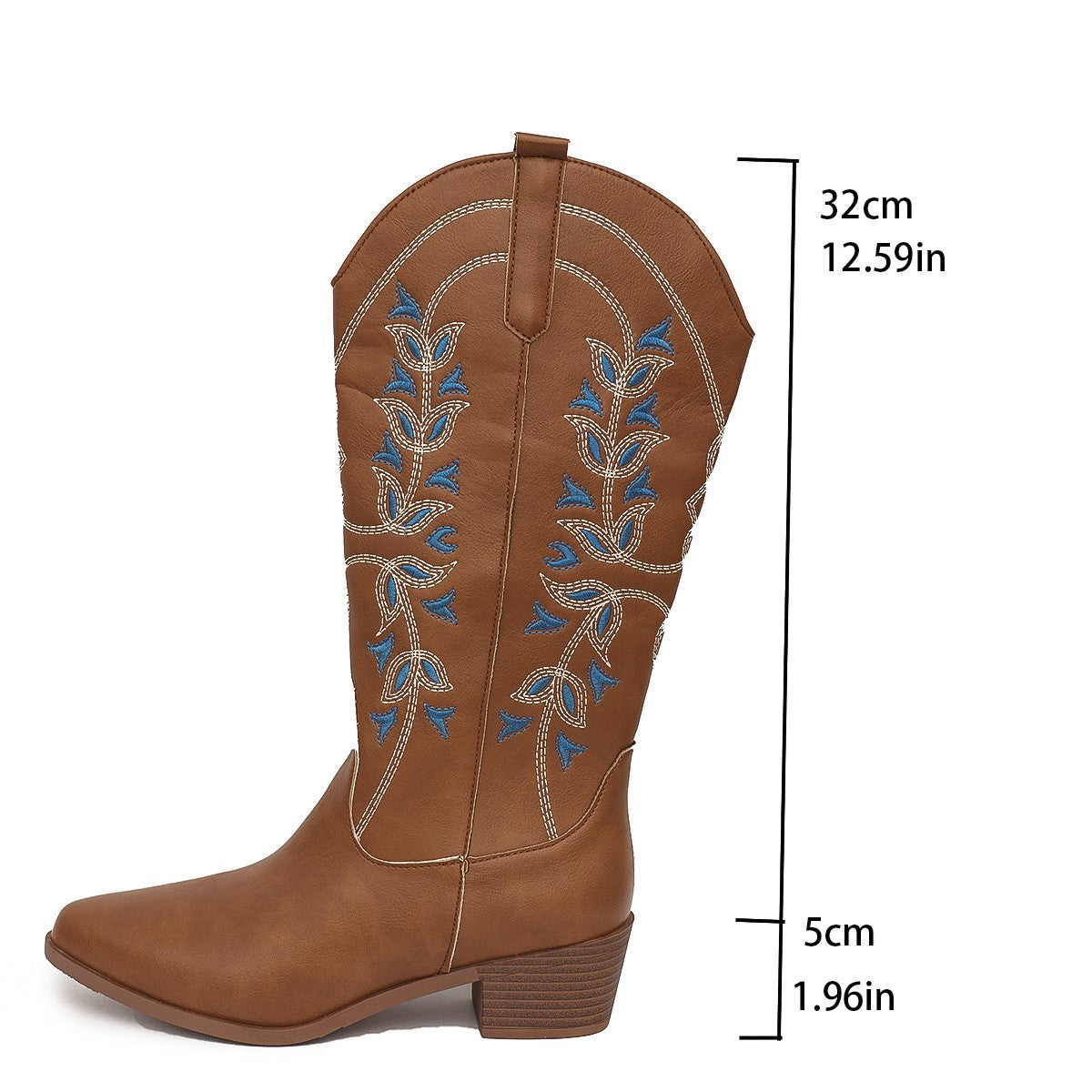 Women’s Embroidered Western Cowboy Boots Saddle up in style with these Embroidered Western Cowboy Boots — where rugged charm meets refined fashion. With a sharp pointed toe, chunky 6–8 cm heel, and intricate embroidered detailing, these boots channel classic Western spirit with a modern edge.
