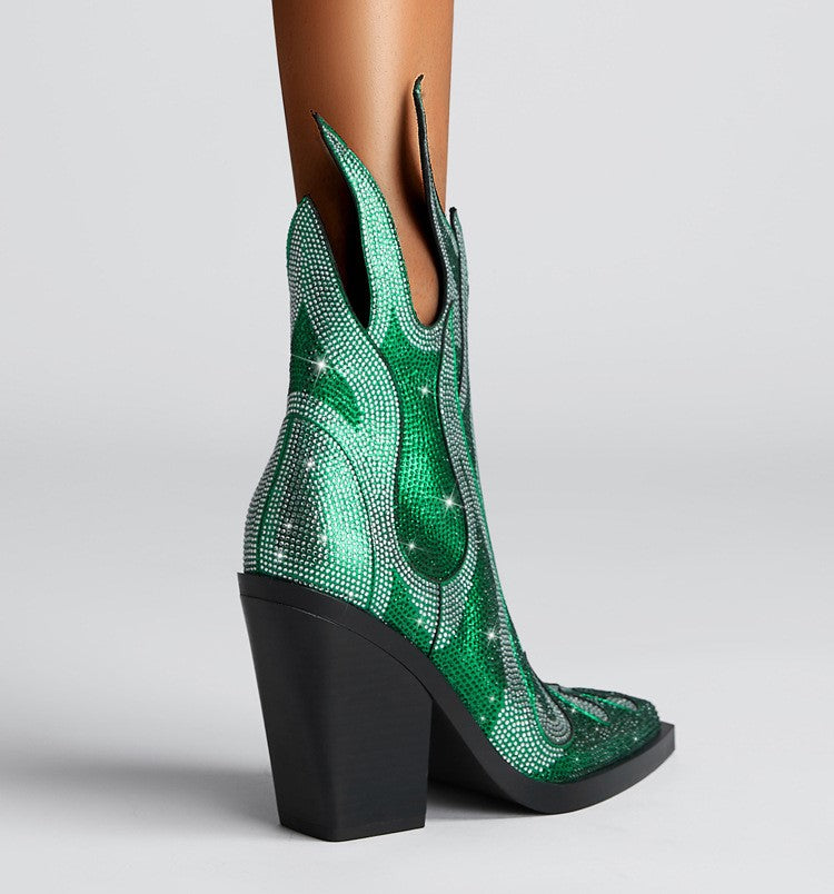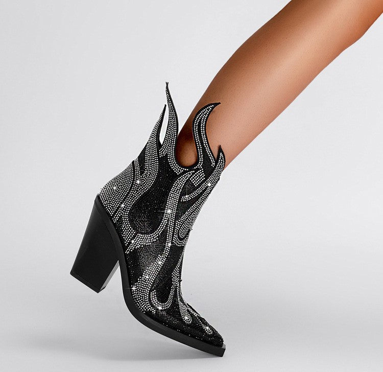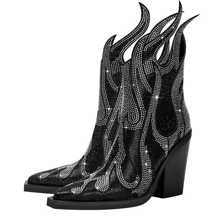 • Featuring shimmering rhinestone flame accents, a square toe, and a chunky high heel, these boots fuse high fashion with unapologetic personality.