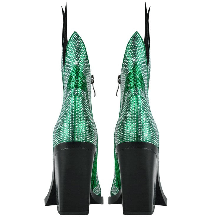 • Key Features Rhinestone flame design for standout glamour Square toe with a sleek, low-tube silhouette Super high chunky heel (8cm+) for dramatic lift Breathable, non-slip, and wear-resistant construction Convenient side zipper closure Colours: Green, Rose Red, Black, Gold, Silver Sizes: 35–39 standard; 40–43 custom, non-returnable Product Details Upper Material: Microfiber Lining Material: Imitation leather Sole Material: Rubber Sole Craft: Glued Boot Height: Low tube Heel Height: Super high (8cm+) Heel Shape: Chunky heel Toe Shape: Square Closure: Side zipper Sizes: 35, 36, 37, 38, 39 (standard); 40, 41, 42, 43 (custom, non-returnable) Colours: Green, Rose Red, Black, Gold, Silver Popular Element: Rhinestone flame design Functions: Height increasing, breathable, non-slip, wear-resistant Gender: Female Age Group: Adult Season: Spring, Summer, Autumn, Winter Style: European & American fashion Ideal For: Nights out, concerts, festivals, parties, or adding a statement edge to everyday outfits.