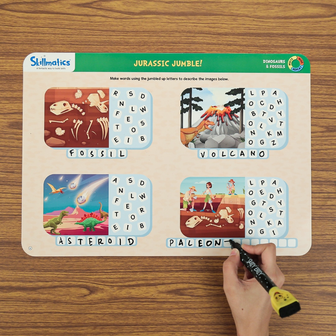 Skillmatics Educational Game – Dinosaurs & Fossils (Ages 6–9) Spark curiosity and make learning fun with the Skillmatics Dinosaurs & Fossils Activity Set. Designed for children aged 6–9, this reusable game introduces kids to prehistoric life, fossils, and dinosaur habitats through interactive play.